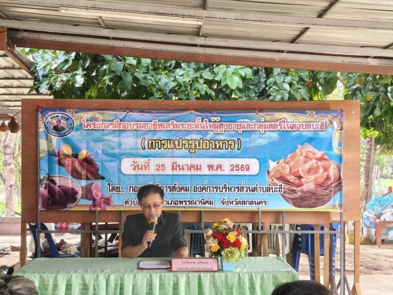 เมื่อวันพุธที่ 25 มีนาคม พ.ศ. 2569 องค์การบริหารส่วนตำบลบะฮีได้จัดการฝึกอบรมอาชีพเสริมระยะสั้นในด้านการแปรรูปอาหาร สำหรับกลุ่มผู้สูงอายุและสตรีในพื้นที่ตำบลบะฮี โดยมีนายประมาณ สุนันธรรม นายกองค์การบริหารส่วนตำบลบะฮี ให้เกียรติเป็นประธานในพิธีเปิด พร้อมด้วยนางเยาวลักษณ์ ไชยปัญหา รองนายกองค์การบริหารส่วนตำบลบะฮี, นายฏัณวิวัฒน์ ปัดภัย ปลัดองค์การบริหารส่วนตำบลบะฮี, รวมถึงหัวหน้าส่วนราชการและผู้นำชุมชนเข้าร่วมงานครั้งนี้ วัตถุประสงค์หลักของการจัดกิจกรรมคือเพื่อส่งเสริมและพัฒนาศักยภาพทางอาชีพแก่ผู้สูงอายุและสตรี ให้มีความรู้ความสามารถในการแปรรูปอาหาร อีกทั้งยังสนับสนุนการนำวัตถุดิบที่มีอยู่ในท้องถิ่นมาสร้างสรรค์เป็นผลิตภัณฑ์ใหม่ เพื่อก่อให้เกิดอาชีพและเพิ่มรายได้ให้แก่ครัวเรือน ณ ที่ทำการผู้ใหญ่บ้าน หมู่ที่ 1 ตำบลบะฮี อำเภอพรรณานิคม จังหวัดสกลนคร