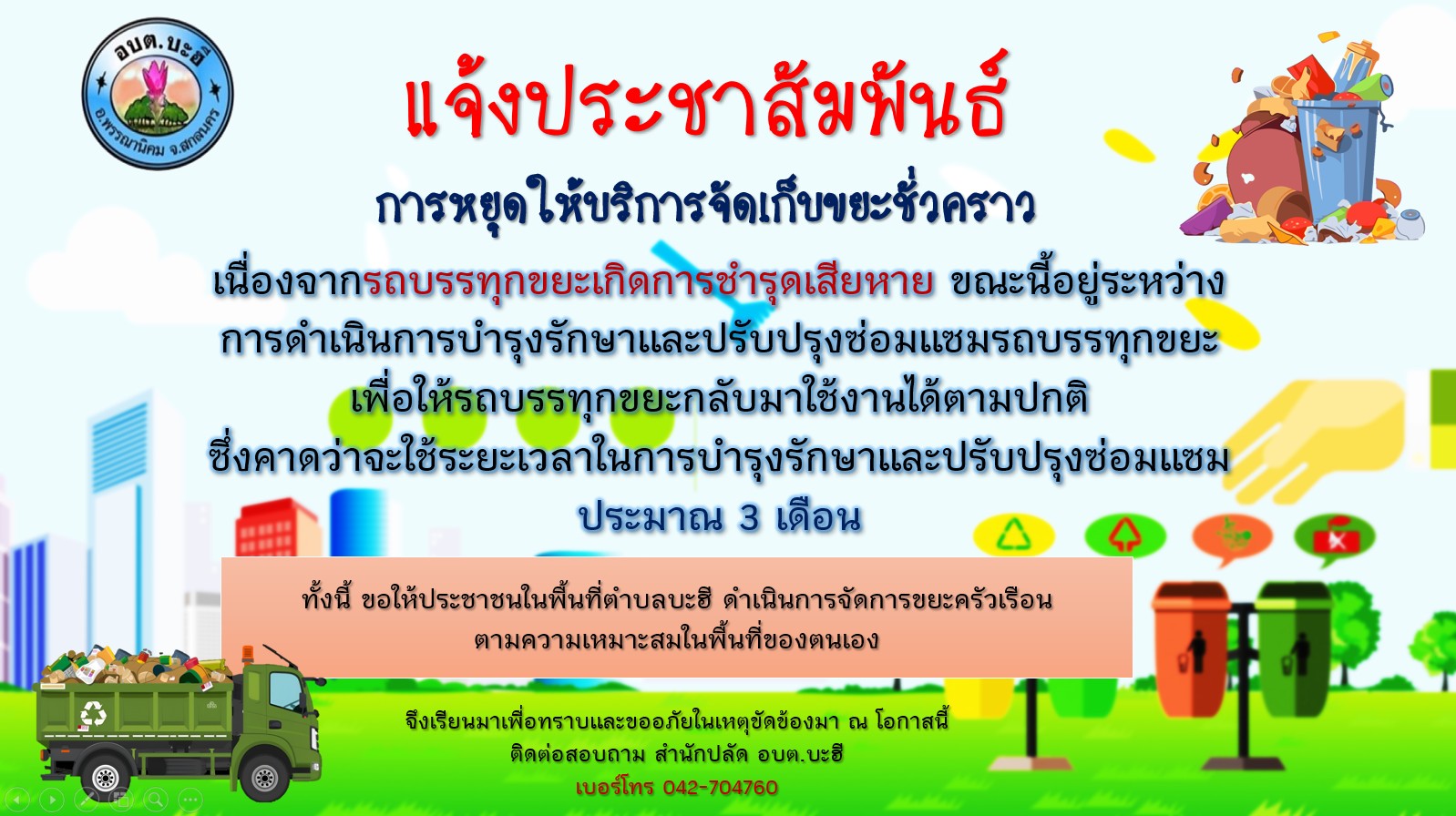 ชื่อเรื่อง : แจ้งประชาสัมพันธ์การหยุดให้บริการจัดเก็บขยะชั่วคราว